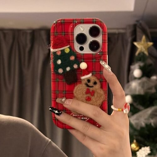 Bring the holiday spirit to your phone with this “Red Plaid 3D Plush Gingerbread Man” silicone case for your Apple